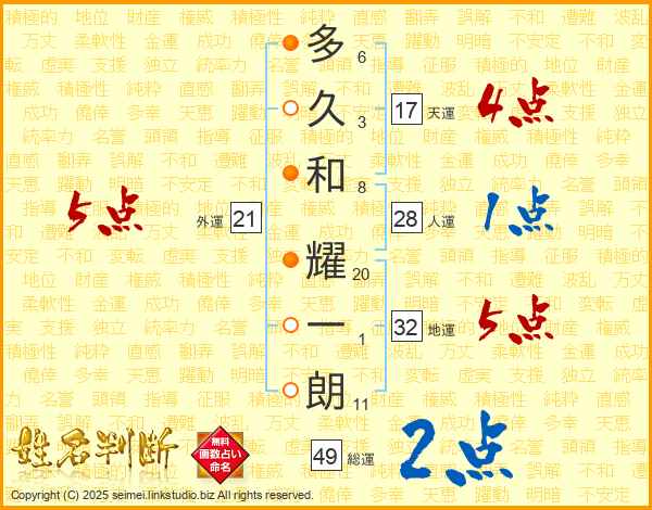 多(6画)久(3画)和(8画) 耀(20画)一(1画)朗(11画)