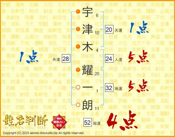 宇津木耀一朗さんの総運は52画の4点!