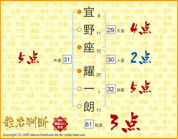 宜(8画)野(11画)座(10画) 耀(20画)一(1画)朗(11画)