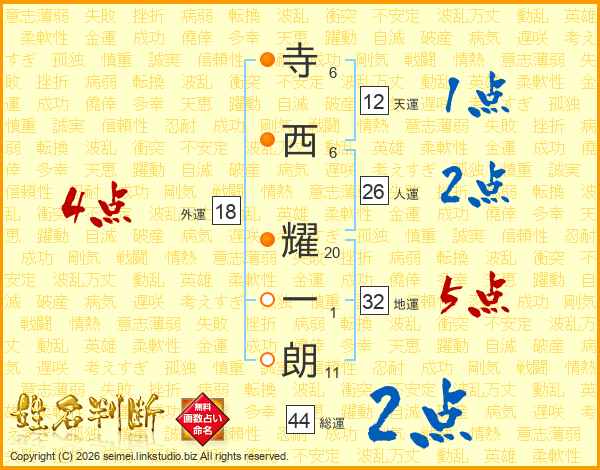 寺西耀一朗さんの人運は26画の2点!