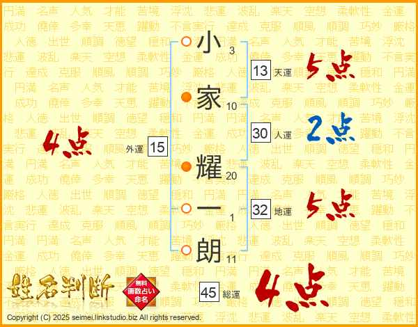 生活面を象徴する運勢です。外部から受ける影響力を表し、結婚運、家庭運や職場、環境への順応性を表します。総運から人運を引いた画数。姓や名が1文字の場合を除く。