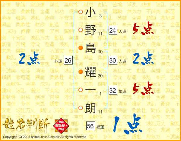 小(3画)野(11画)島(10画) 耀(20画)一(1画)朗(11画)