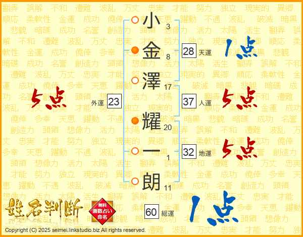 小(3画)金(8画)澤(17画) 耀(20画)一(1画)朗(11画)