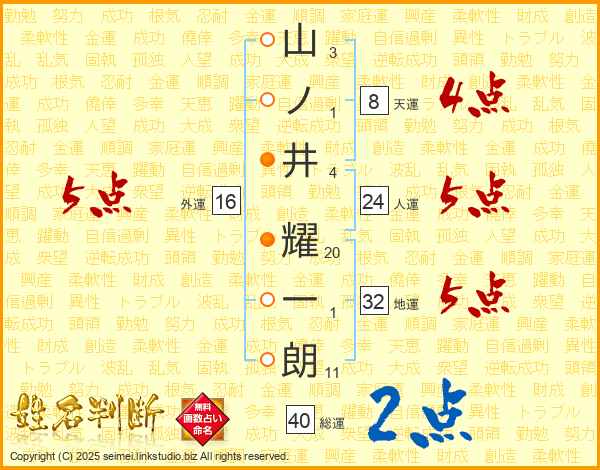 山(3画)ノ(1画)井(4画) 耀(20画)一(1画)朗(11画)