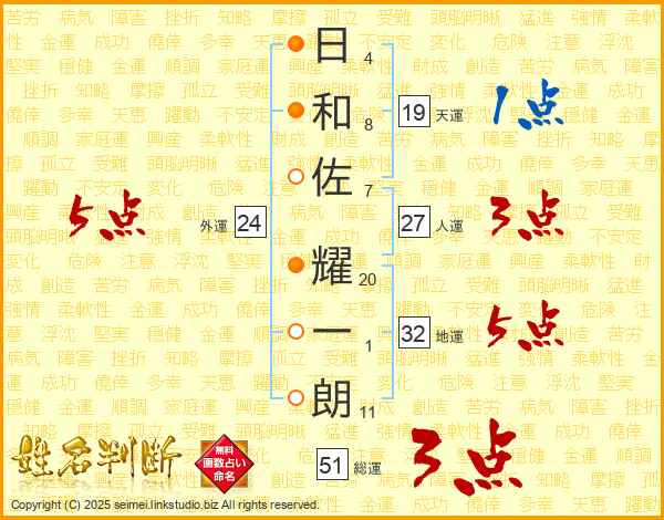 日(4画)和(8画)佐(7画) 耀(20画)一(1画)朗(11画)