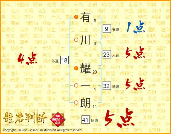 有川耀一朗さんの総運は41画の5点!
