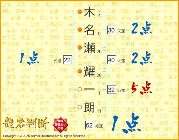 木(4画)名(6画)瀬(20画) 耀(20画)一(1画)朗(11画)