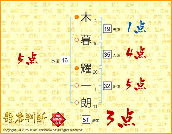 木(4画)暮(15画) 耀(20画)一(1画)朗(11画)