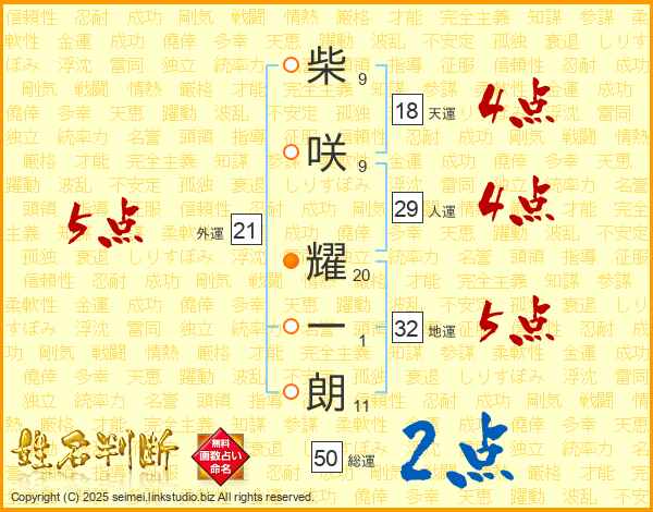 柴(9画)咲(9画) 耀(20画)一(1画)朗(11画)