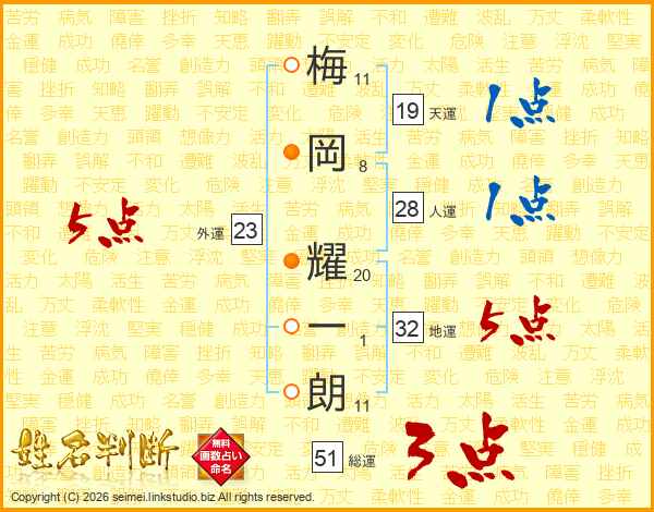 梅(11画)岡(8画) 耀(20画)一(1画)朗(11画)