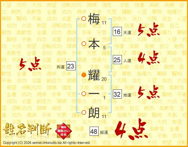 梅(11画)本(5画) 耀(20画)一(1画)朗(11画)