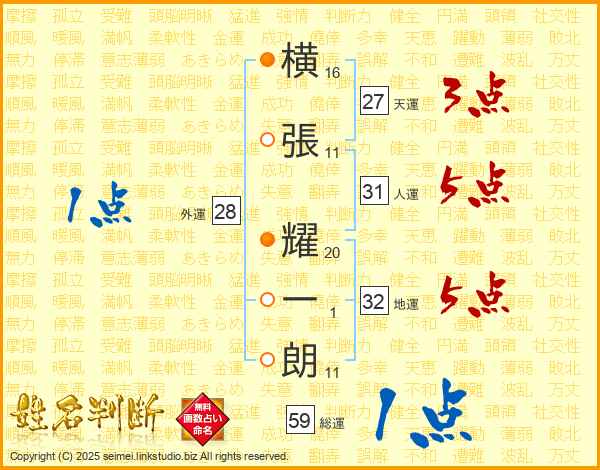 横(16画)張(11画) 耀(20画)一(1画)朗(11画)