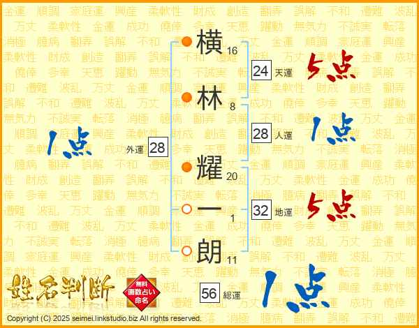 横(16画)林(8画) 耀(20画)一(1画)朗(11画)