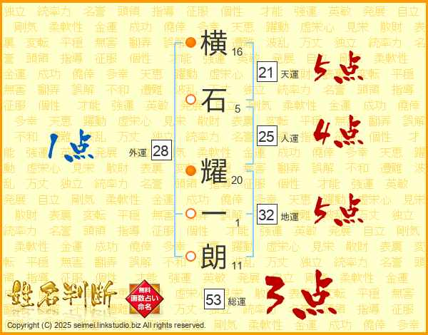 横(16画)石(5画) 耀(20画)一(1画)朗(11画)