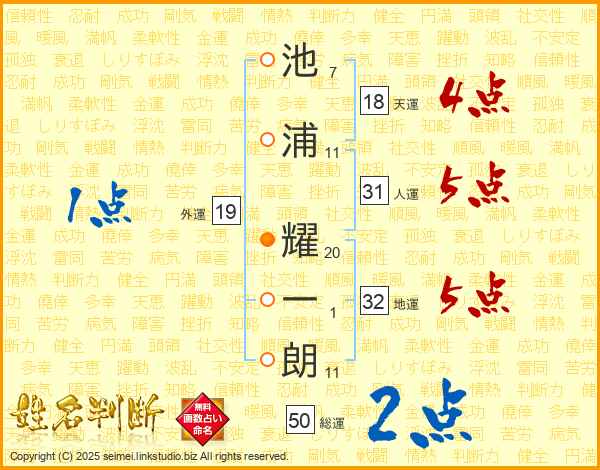 池(7画)浦(11画) 耀(20画)一(1画)朗(11画)