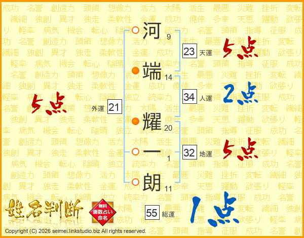 あなたの人生を表す1番重要な運勢です。生涯を通じて影響する総合運となり、主に50歳以降の晩年期に影響を及ぼします。苗字と名前の合計画数。