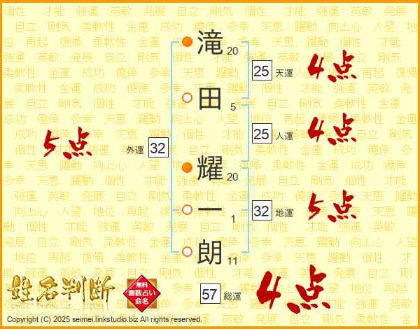 滝(20画)田(5画) 耀(20画)一(1画)朗(11画)