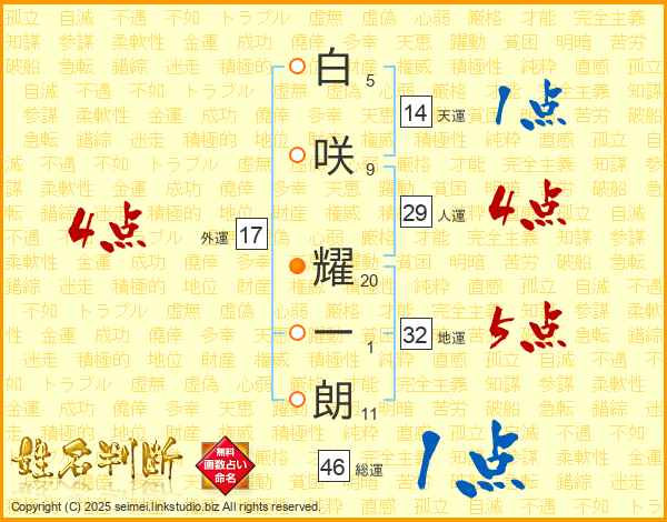 白咲耀一朗さんの総運は46画の1点!