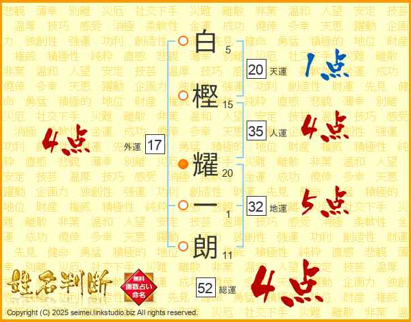 白(5画)樫(15画) 耀(20画)一(1画)朗(11画)