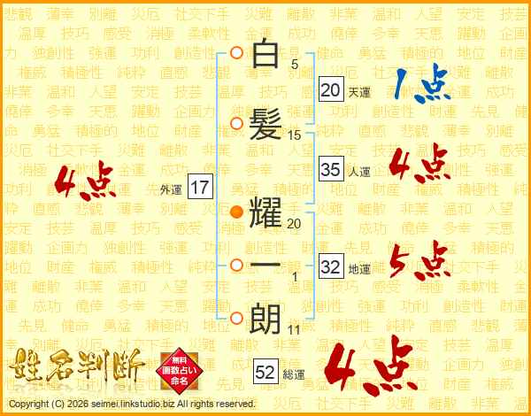 白(5画)髪(15画) 耀(20画)一(1画)朗(11画)