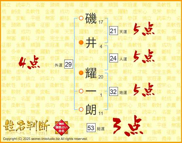 磯(17画)井(4画) 耀(20画)一(1画)朗(11画)