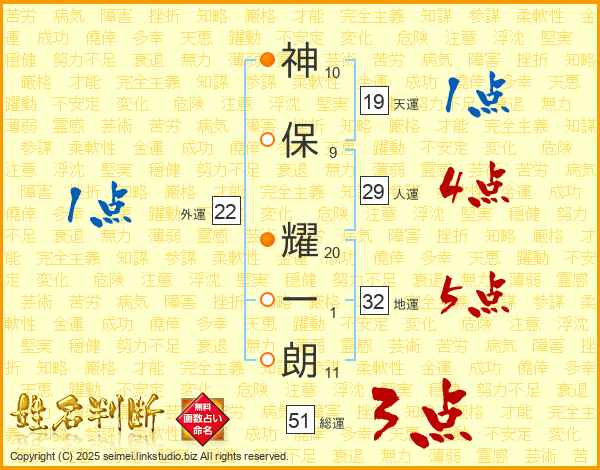 神(10画)保(9画) 耀(20画)一(1画)朗(11画)