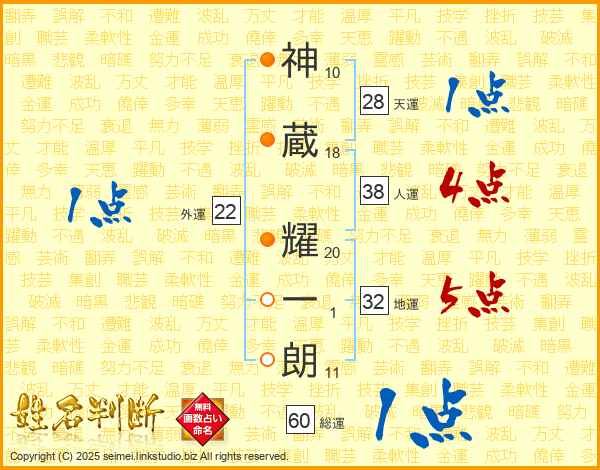 神(10画)蔵(18画) 耀(20画)一(1画)朗(11画)