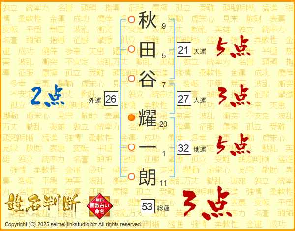 秋(9画)田(5画)谷(7画) 耀(20画)一(1画)朗(11画)
