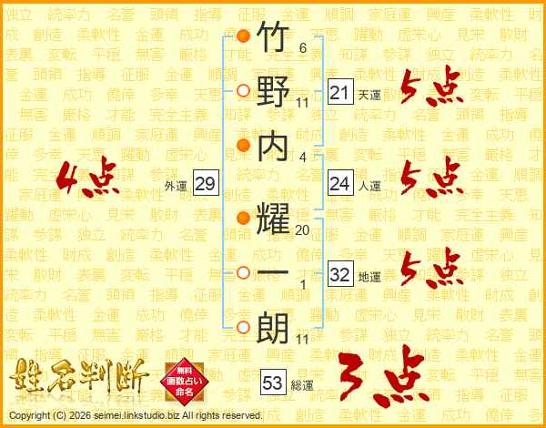 竹(6画)野(11画)内(4画) 耀(20画)一(1画)朗(11画)
