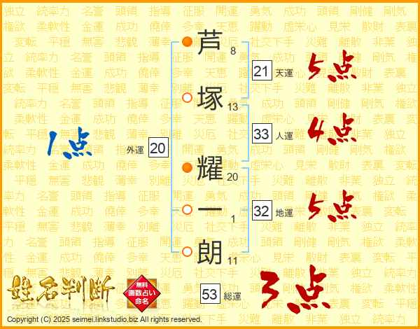 芦(8画)塚(13画) 耀(20画)一(1画)朗(11画)