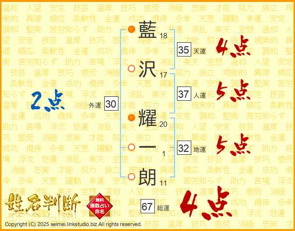 藍(18画)沢(17画) 耀(20画)一(1画)朗(11画)
