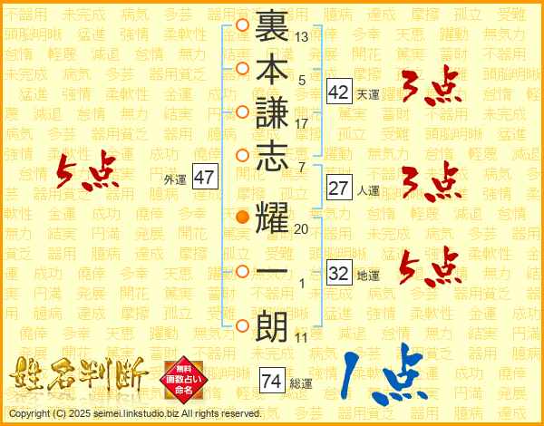 裏(13画)本(5画)謙(17画)志(7画) 耀(20画)一(1画)朗(11画)