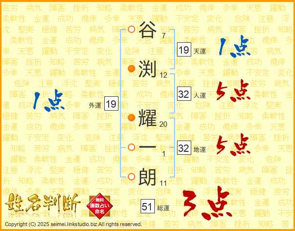 谷(7画)渕(12画) 耀(20画)一(1画)朗(11画)
