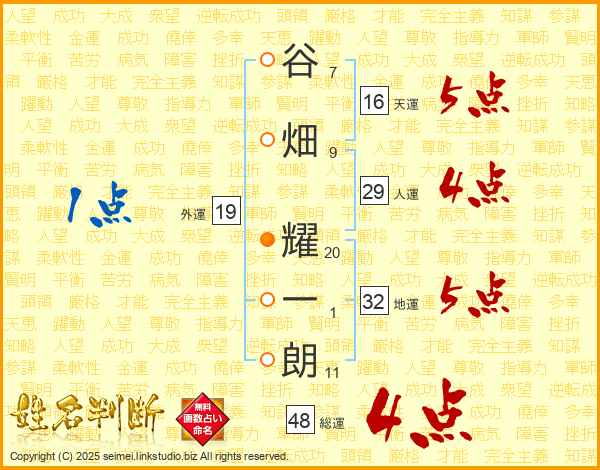 谷(7画)畑(9画) 耀(20画)一(1画)朗(11画)
