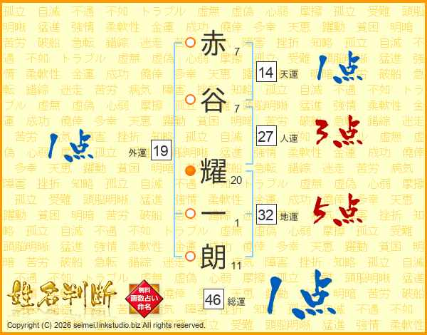 赤(7画)谷(7画) 耀(20画)一(1画)朗(11画)