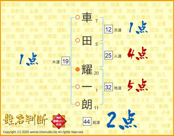 車(7画)田(5画) 耀(20画)一(1画)朗(11画)