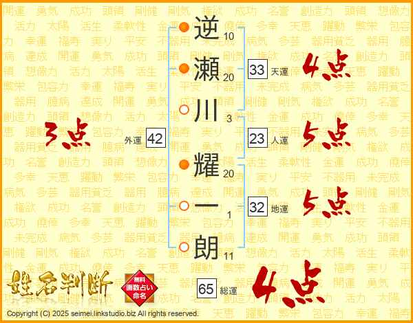 逆瀬川耀一朗さんの総運は65画の4点!