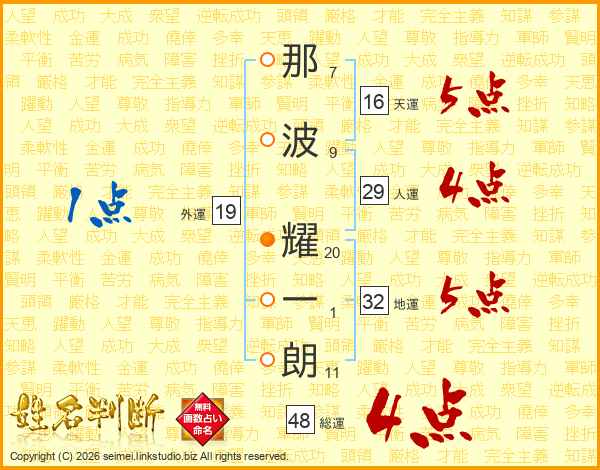 生活面を象徴する運勢です。外部から受ける影響力を表し、結婚運、家庭運や職場、環境への順応性を表します。総運から人運を引いた画数。姓や名が1文字の場合を除く。