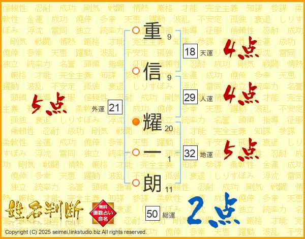 重(9画)信(9画) 耀(20画)一(1画)朗(11画)