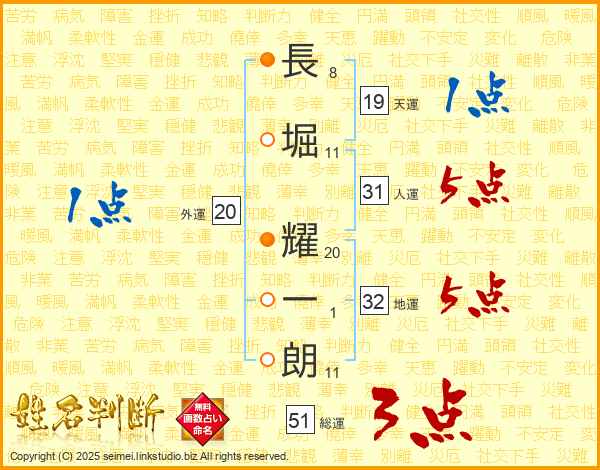 長(8画)堀(11画) 耀(20画)一(1画)朗(11画)