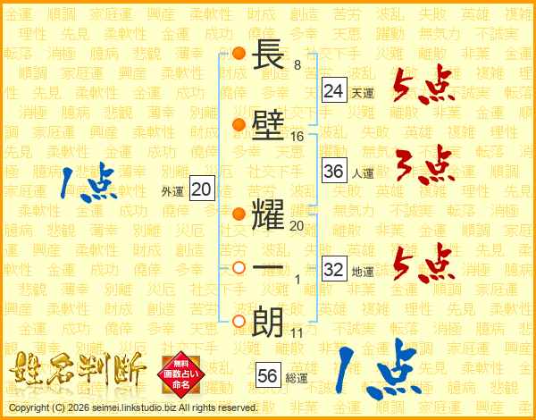 長(8画)壁(16画) 耀(20画)一(1画)朗(11画)