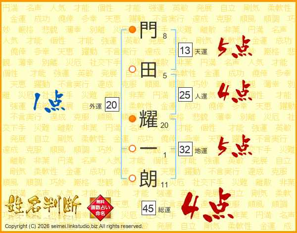 門(8画)田(5画) 耀(20画)一(1画)朗(11画)