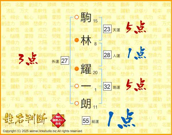 駒(15画)林(8画) 耀(20画)一(1画)朗(11画)