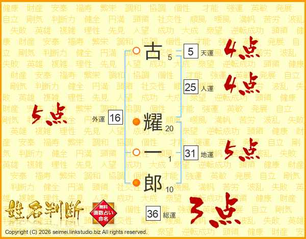 古(5画) 耀(20画)一(1画)郎(10画)