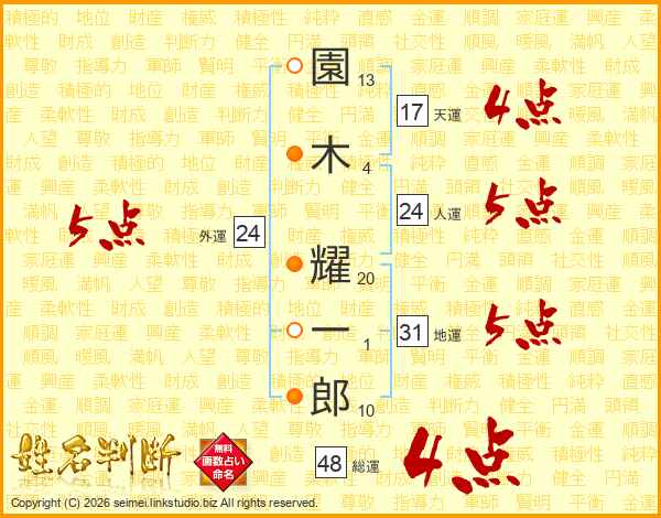 園(13画)木(4画) 耀(20画)一(1画)郎(10画)