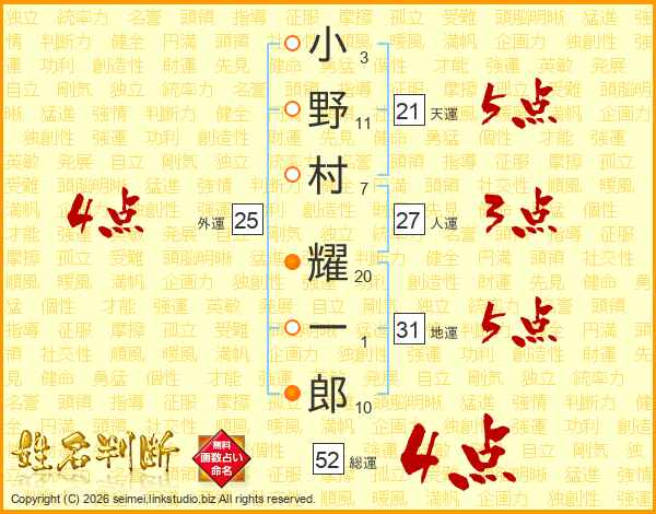 小野村耀一郎さんの総運は52画の4点!