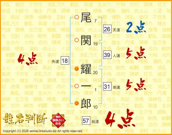 尾(7画)関(19画) 耀(20画)一(1画)郎(10画)