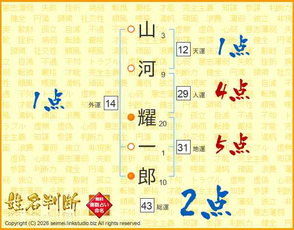 山(3画)河(9画) 耀(20画)一(1画)郎(10画)