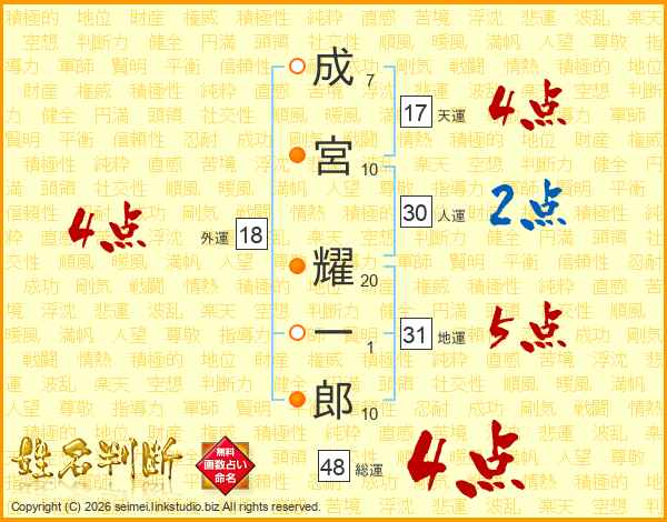 成(7画)宮(10画) 耀(20画)一(1画)郎(10画)