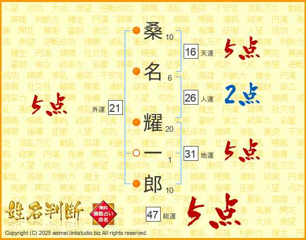 桑(10画)名(6画) 耀(20画)一(1画)郎(10画)